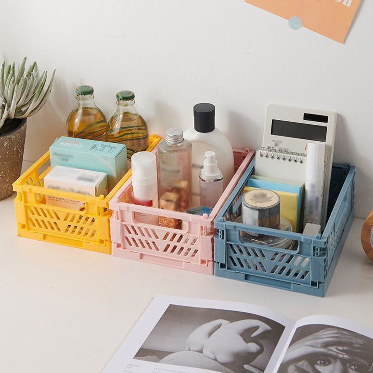 Keep your desktop neat with this foldable plastic storage box set made from durable PP plastic. The hollow-out pattern promotes air circulation while adding a clean look. Though compact at 3.81×5.9×2.36in (9.7×15×6cm), each box offers ample capacity for small items. The collapsible, stackable structure saves space for home or office use, and assorted colours fit various décor styles.