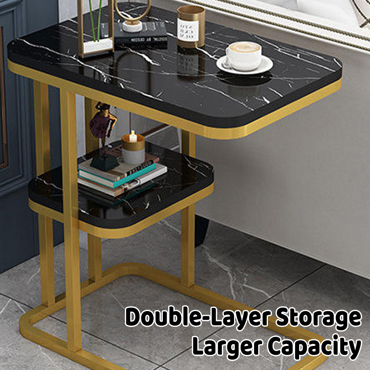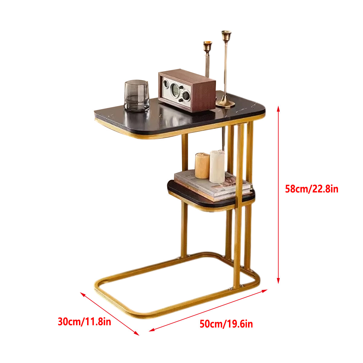 This modern two-tier side table features a marble-patterned surface paired with a gold-toned metal frame, offering style and functionality for contemporary living rooms. The rounded corners improve safety, while the double-layer design provides practical space for books, décor, and daily items. The smooth surface is easy to clean, and the sturdy structure supports long-term use.