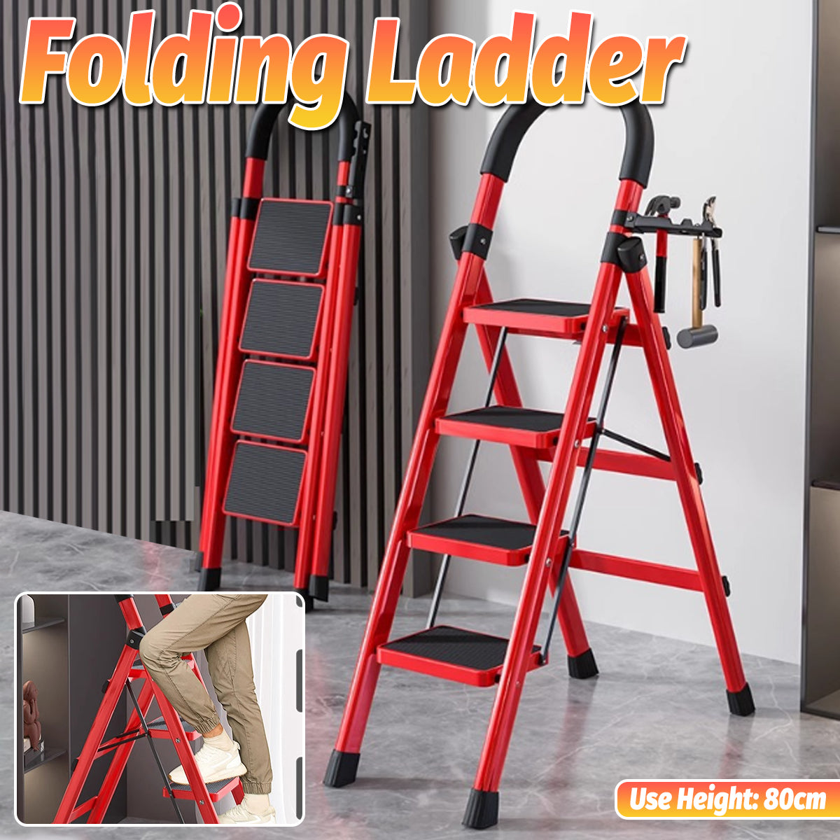 This 4-step folding ladder is made from heavy-duty carbon steel with a red finish. Designed with wider anti-slip pedals and a practical tool rack, it supports everyday tasks in home, kitchen, and garage environments. The foldable structure allows compact storage while maintaining strong load support.