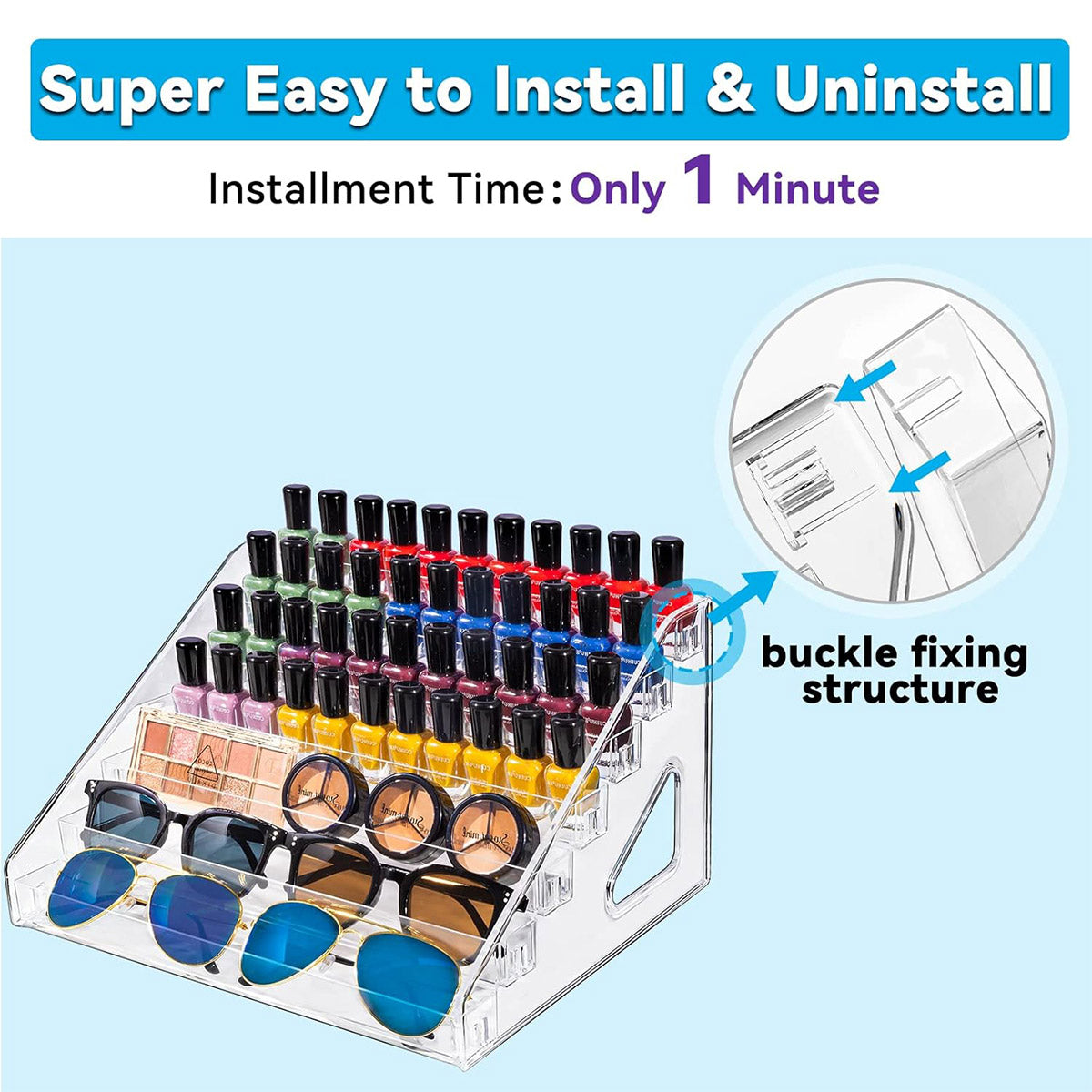 This multi-layer clear storage rack offers a practical way to organise nail polish, essential oils, sunglasses, and makeup items. Made from thickened transparent acrylic, it features a stepped layout for clear visibility and easy access. Suitable for home use, salons, or display counters, it provides a neat and space-saving desktop solution.