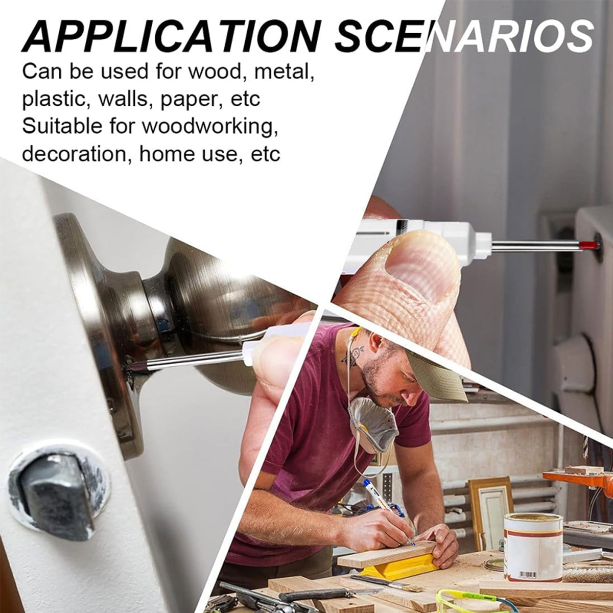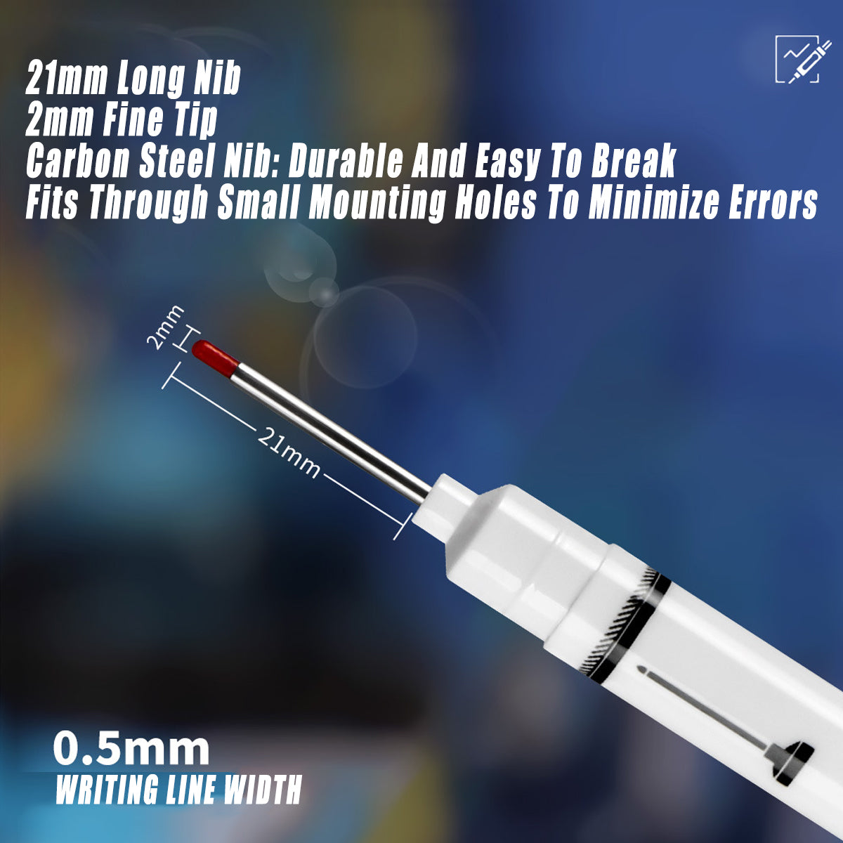 These long-nosed markers are designed for precision work in hard-to-reach areas. Featuring a 20mm fine tip, they are ideal for marking deep holes or narrow spaces. The waterproof, quick-drying ink provides clear, lasting marks on various surfaces, making them versatile for construction, decoration, and general hardware tasks.