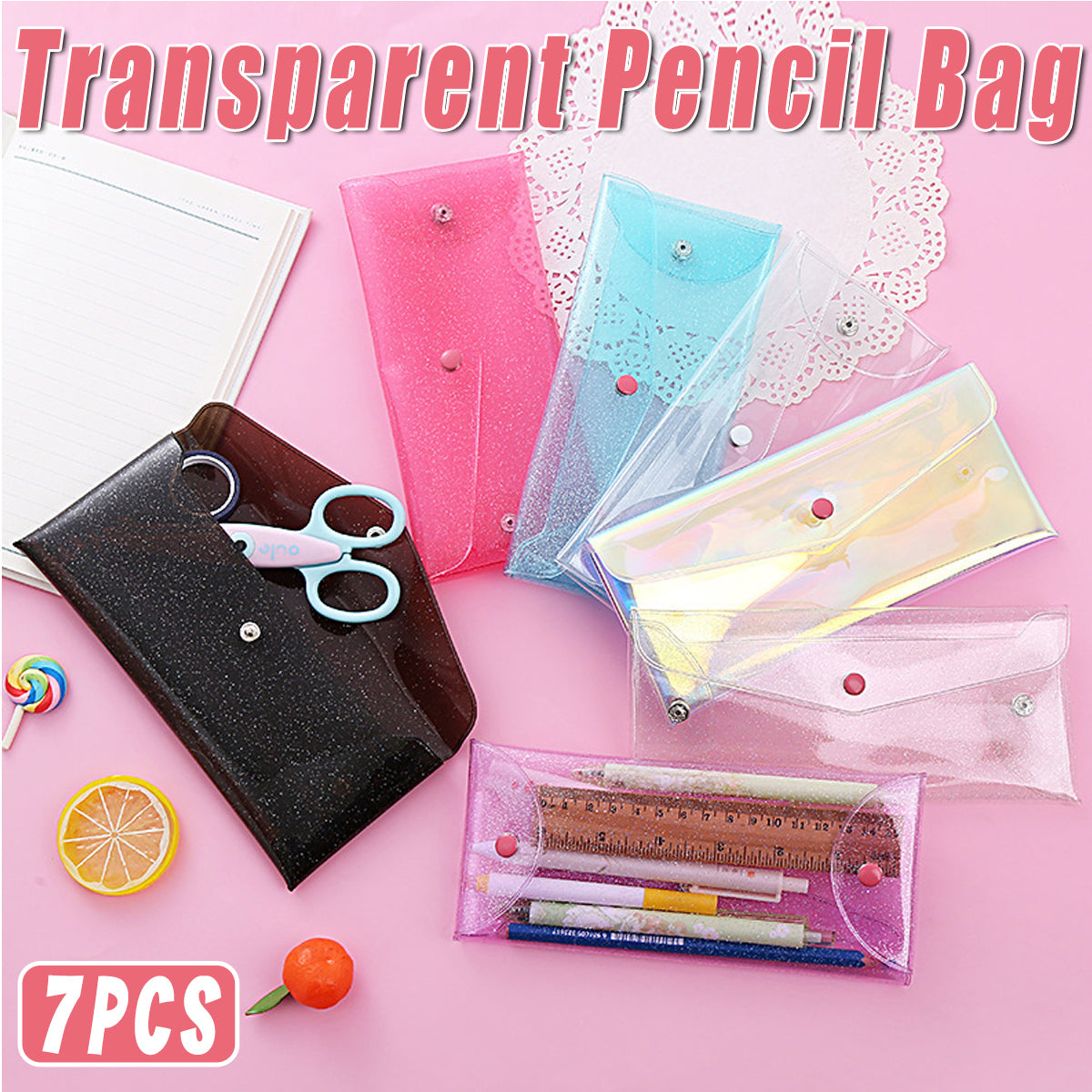 7 Pcs Transparent Pencil Bags PVC Snap Button Assorted Colours