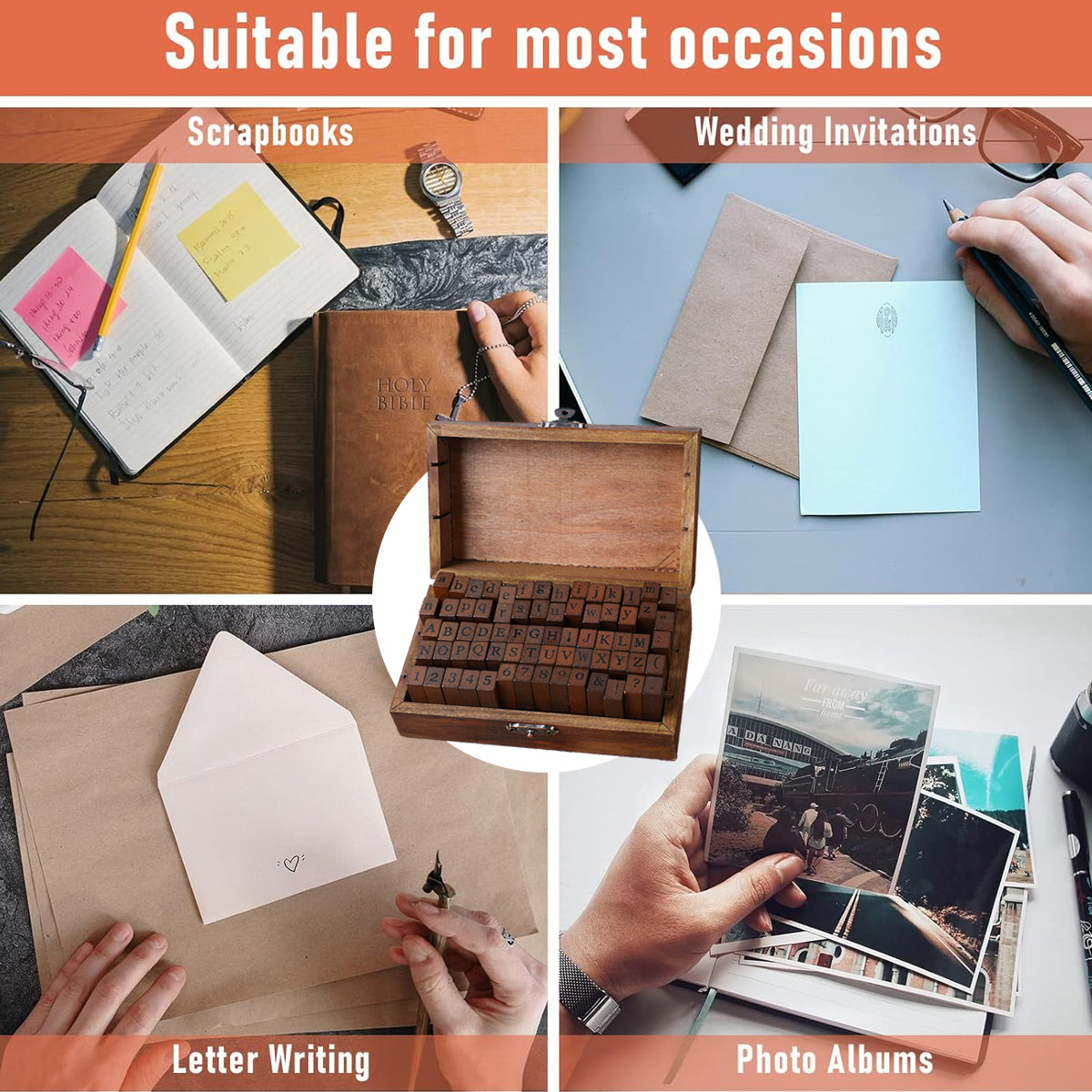 This 70-piece alphabet and number wood rubber stamp set is designed for various crafting projects such as scrapbooking, card making, journaling, and letter writing. The set includes uppercase and lowercase letters, numbers, and punctuation marks, each made from durable wood and rubber. All pieces are neatly stored in a wooden box for easy organisation and convenient use.