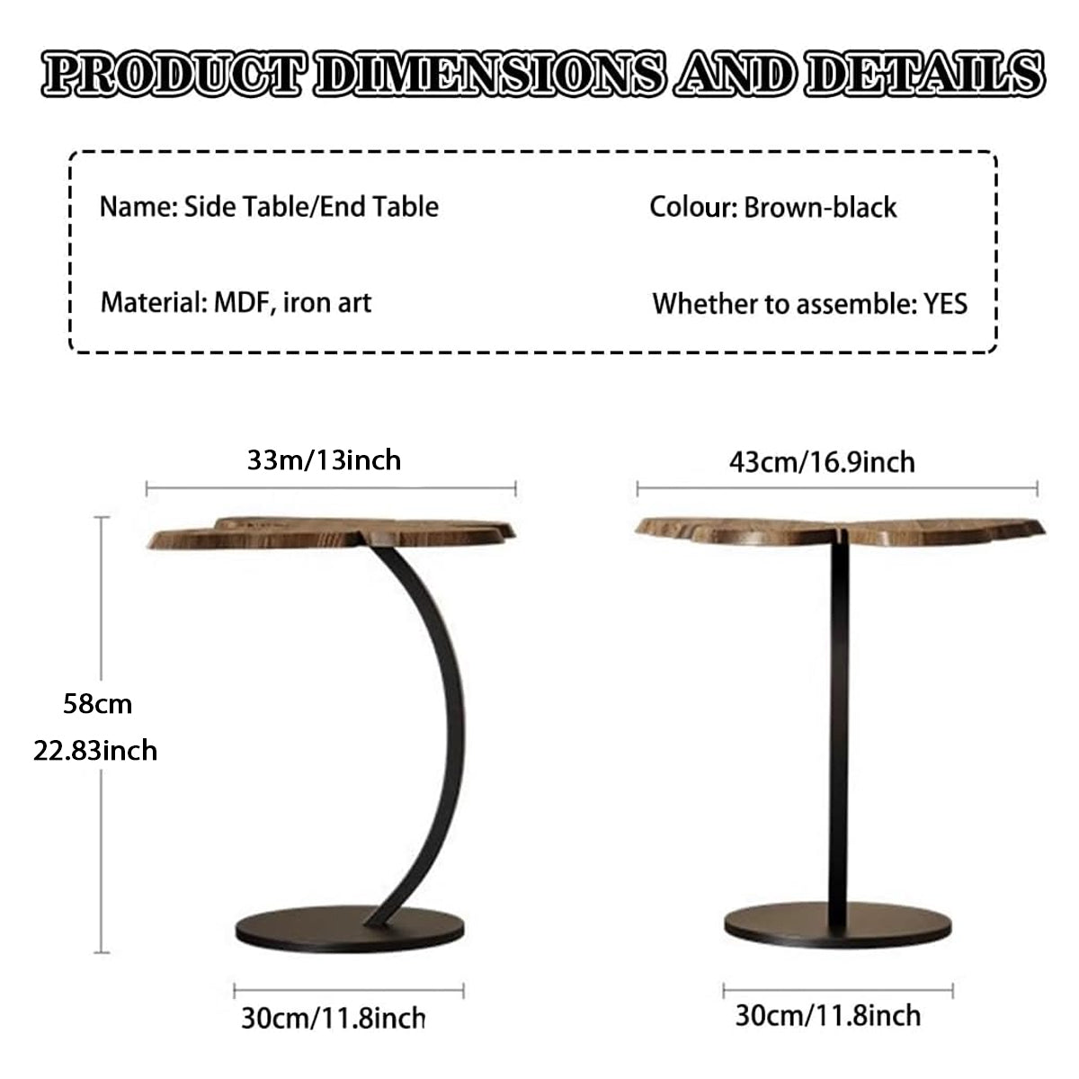 - Dimensions: 58cm height; 43cm table length; 30cm base diameter