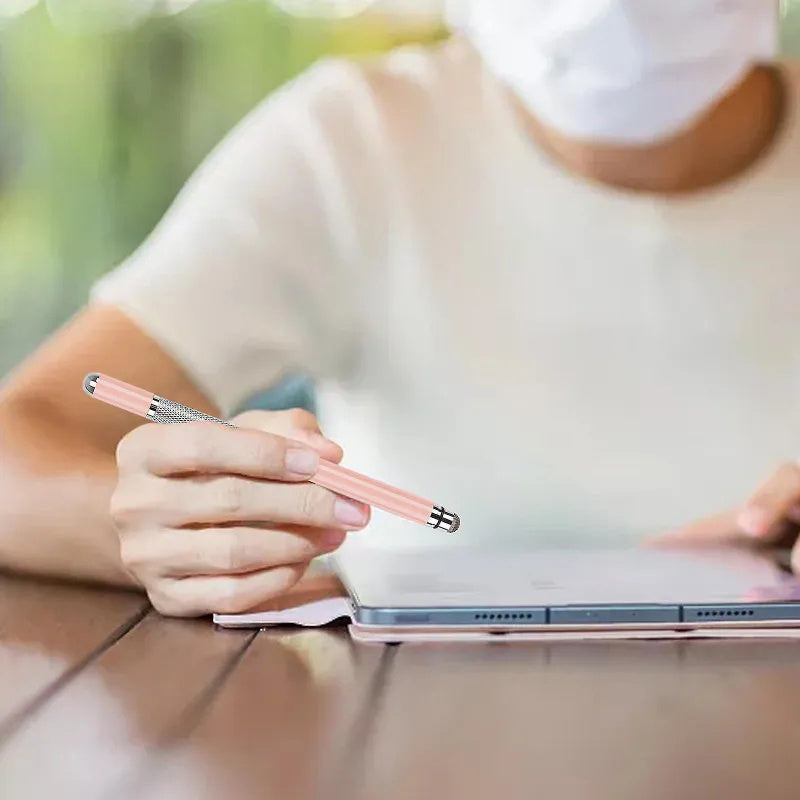 This compact, lightweight capacitive stylus features a 2-in-1 design with a fiber tip at one end and a silicone disc tip at the other. It offers responsive input for drawing, writing, gaming, and everyday navigation on touchscreen devices.