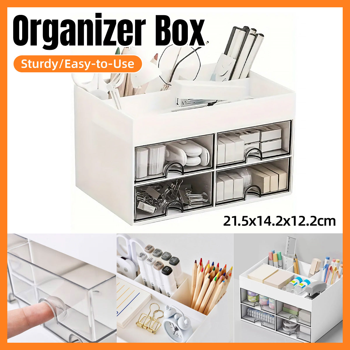 Keep your workspace organised with this large-capacity desktop pen storage box. Multiple compartments and four transparent drawers make it easy to sort pens, pencils, clips, and other essentials while quickly identifying contents. Compact and practical for students, professionals, and home offices.