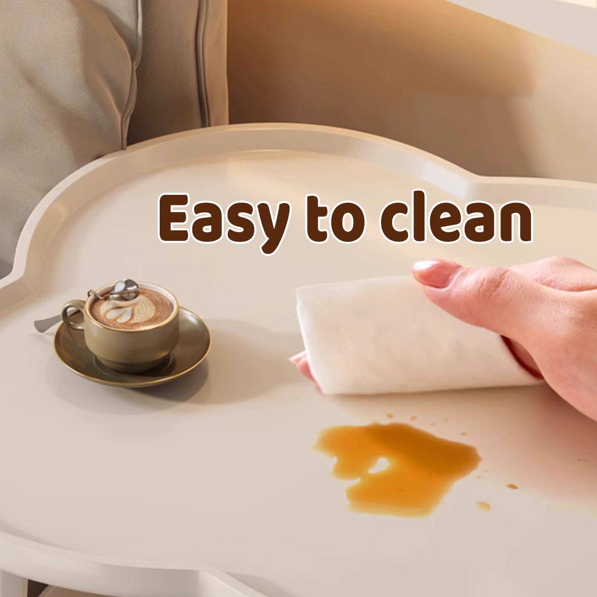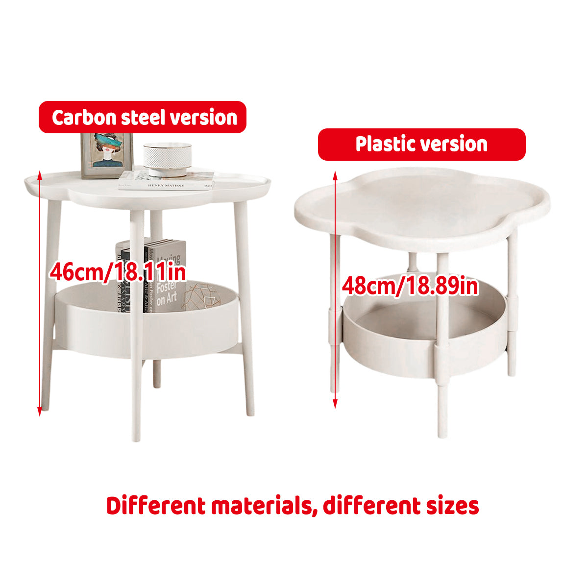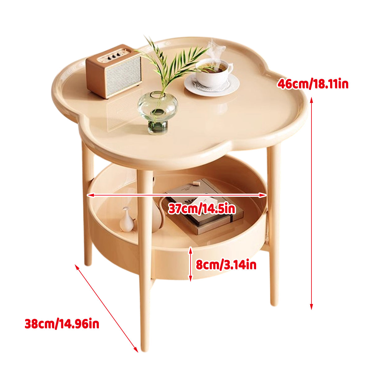 This double-layer side table features a four-leaf clover-shaped top with rounded edges for safety and a lower circular storage shelf. The beige finish complements various home decors while providing practical surface space for drinks, plants, and decor.