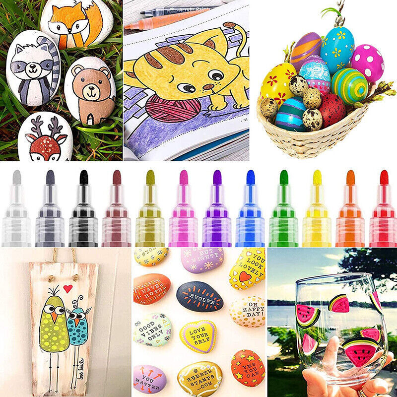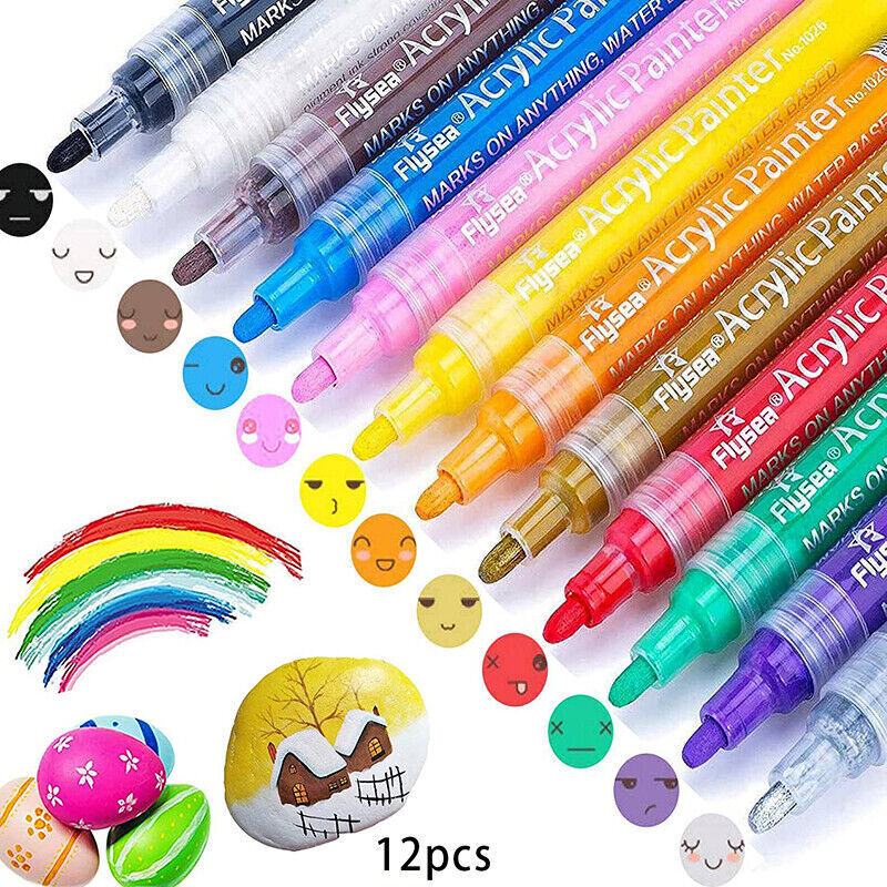These Flysea acrylic paint pens feature vibrant colours and a smooth-writing bullet tip for cards, crafts, and colourful art projects. Water-based, acid-free, odourless ink dries fast and is permanent on most surfaces, making the set useful for a wide range of creative tasks.