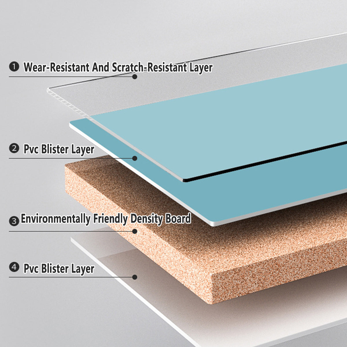 - Multi-Layered Construction: Includes a wear-resistant and scratch-resistant layer, PVC blister layers, and eco-friendly density board for durability.