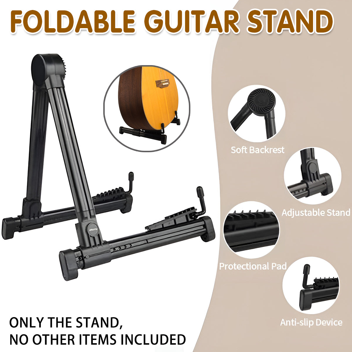 This folding guitar stand provides a compact and secure way to store or display acoustic, folk, and classical guitars. Flexible contact points with non-slip rubber pads help prevent scratches and slipping, while the floor-standing design includes a hook lock system and top stabiliser for added safety. The foldable structure makes it suitable for home use, studios, and travel.