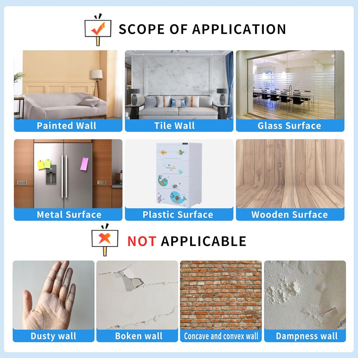 - Apply only to clean, smooth surfaces; not suitable for dusty, broken, uneven, or damp walls.