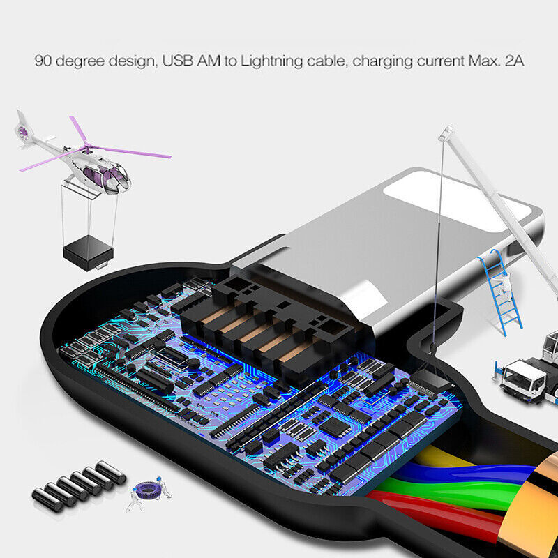 This heavy-duty USB charging cable provides fast charging and stable data transfer for iPhone, iPad, and iPod devices. Designed with a 90-degree elbow connector, it offers a comfortable grip when using the device while charging. The cable features durable fiber-braided material, an intelligent data chip, and LED light modes for convenient use in different environments.