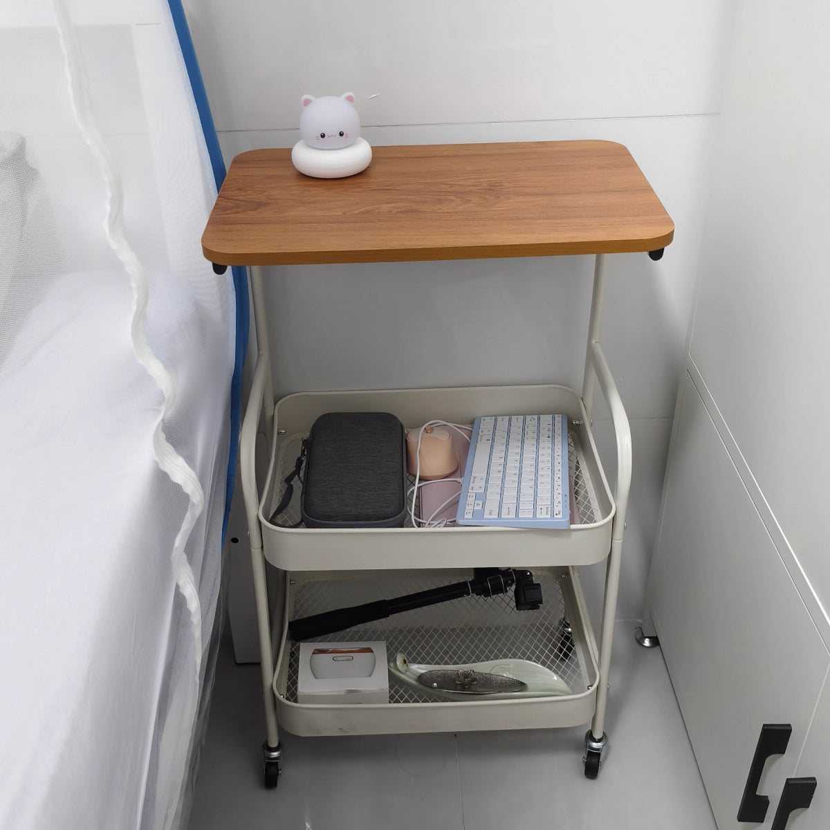 This multi-layer coffee table features rolling caster wheels for smooth mobility, offering practical storage for living rooms, kitchens, and other home spaces. With layered shelves, a breathable mesh basket, and a secure fence design, it provides convenient organization while remaining easy to move and position as needed.