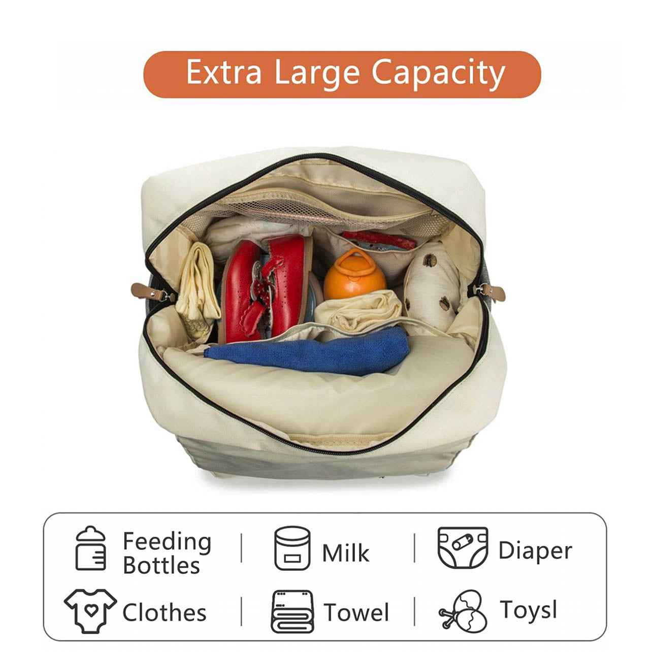 - Large capacity: Holds a laptop and various baby essentials such as diapers, bottles, clothes, toys, and more.