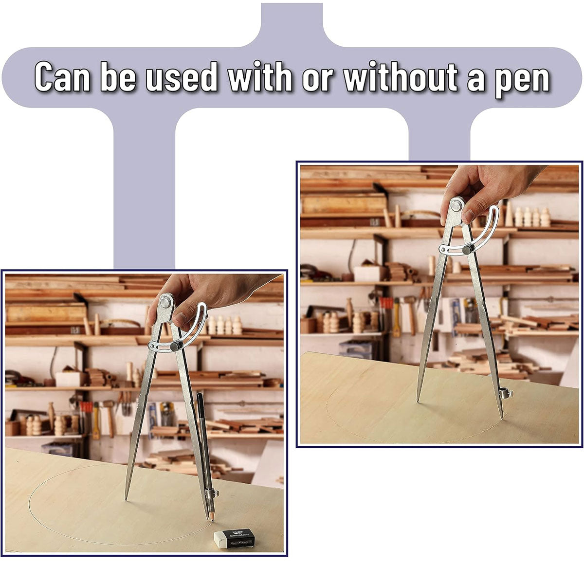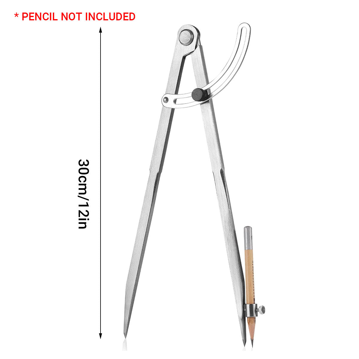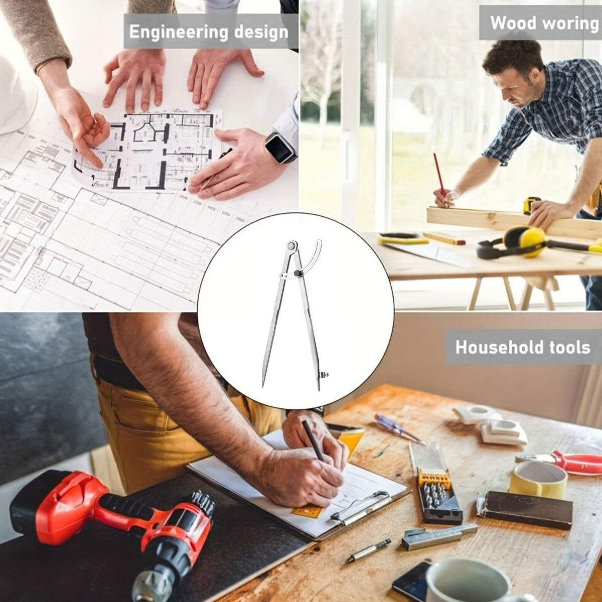 This professional compass is crafted from high carbon steel and designed for accurate math drawing, engineering drafting, leatherworking, and woodworking tasks. It features a lockable wing, stable rivet joint, and an attached pencil holder to support precise measurement and marking workflows.