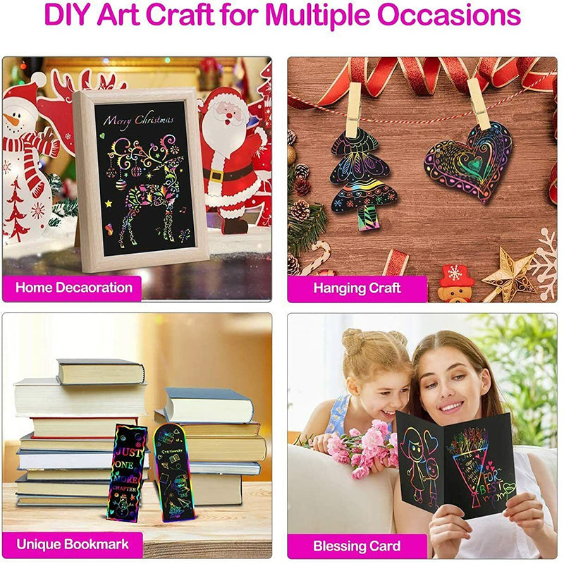 This scratch paper set is perfect for kids’ creative crafts and DIY sketching, blending fun and skill-building. The black-coated scratch paper reveals bright rainbow colours when scraped with the included bamboo pen, inspiring imagination for drawing, doodles, notepads, or Thanksgiving cards. Made of non-toxic quality cardboard, it’s safe for kids and fits most ages—ideal for training hands-on skills, concentration, and intelligence. It also works as room craft decorations, making it a versatile gift for boys and girls. Note: Size may have 1–3cm deviation; actual product colour may differ slightly.
