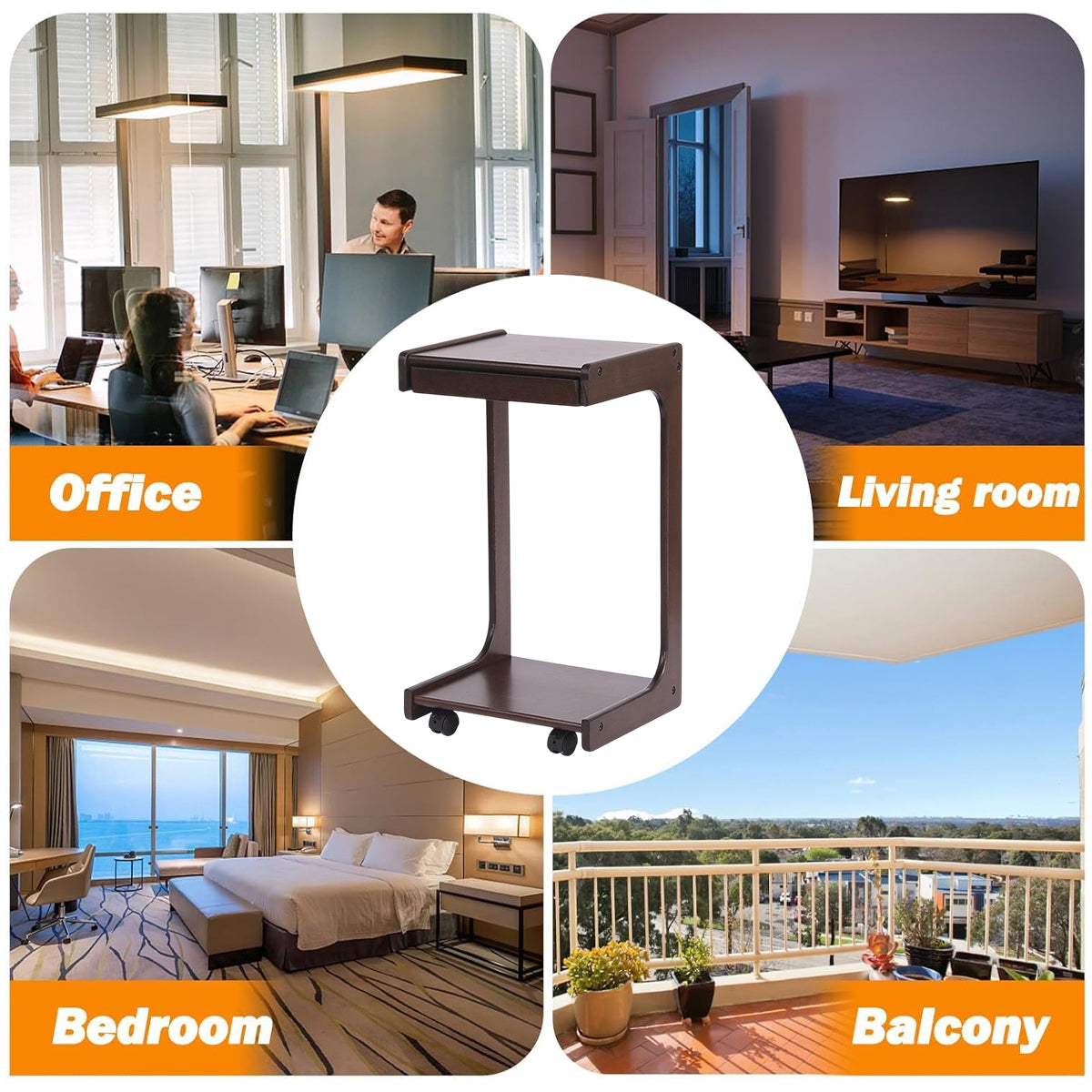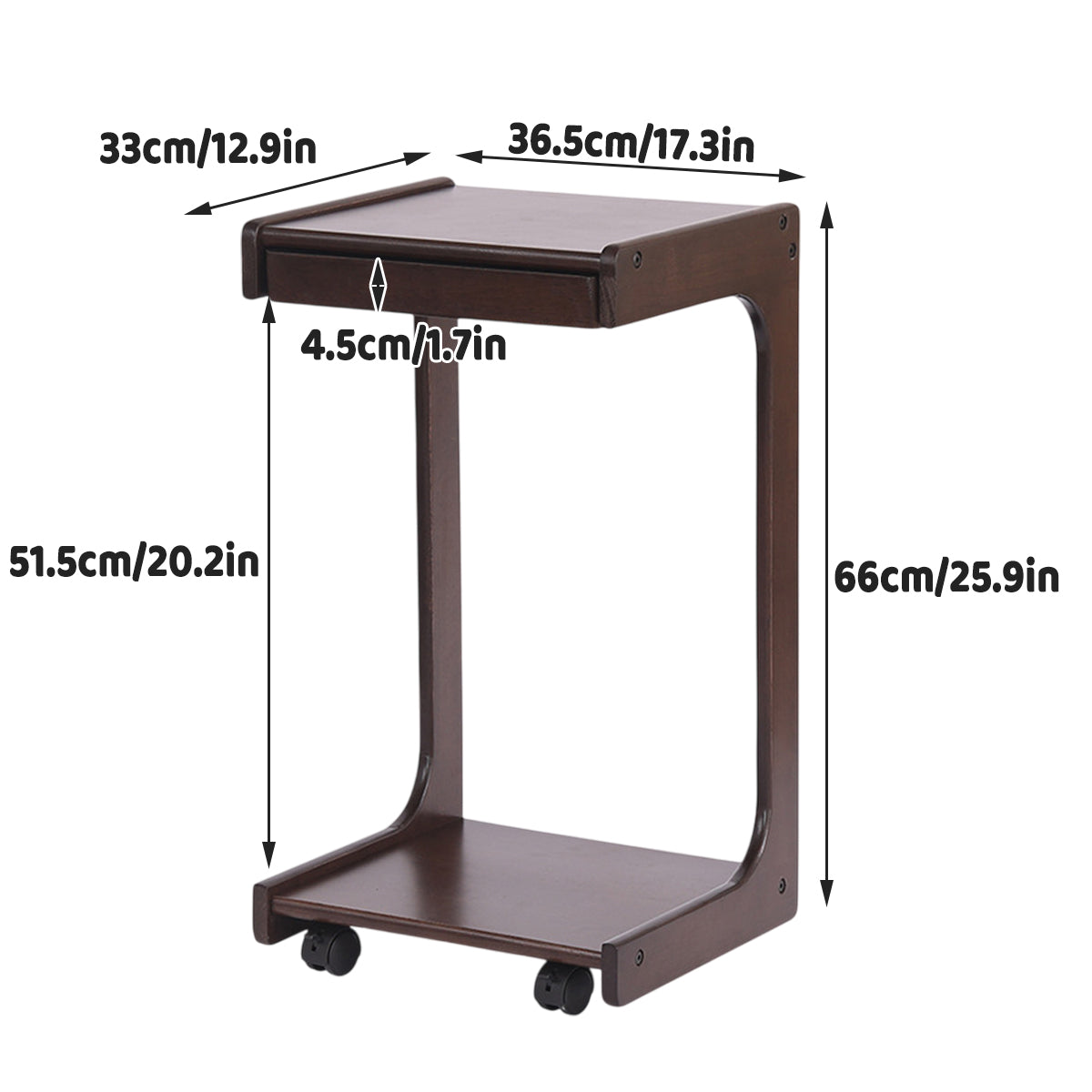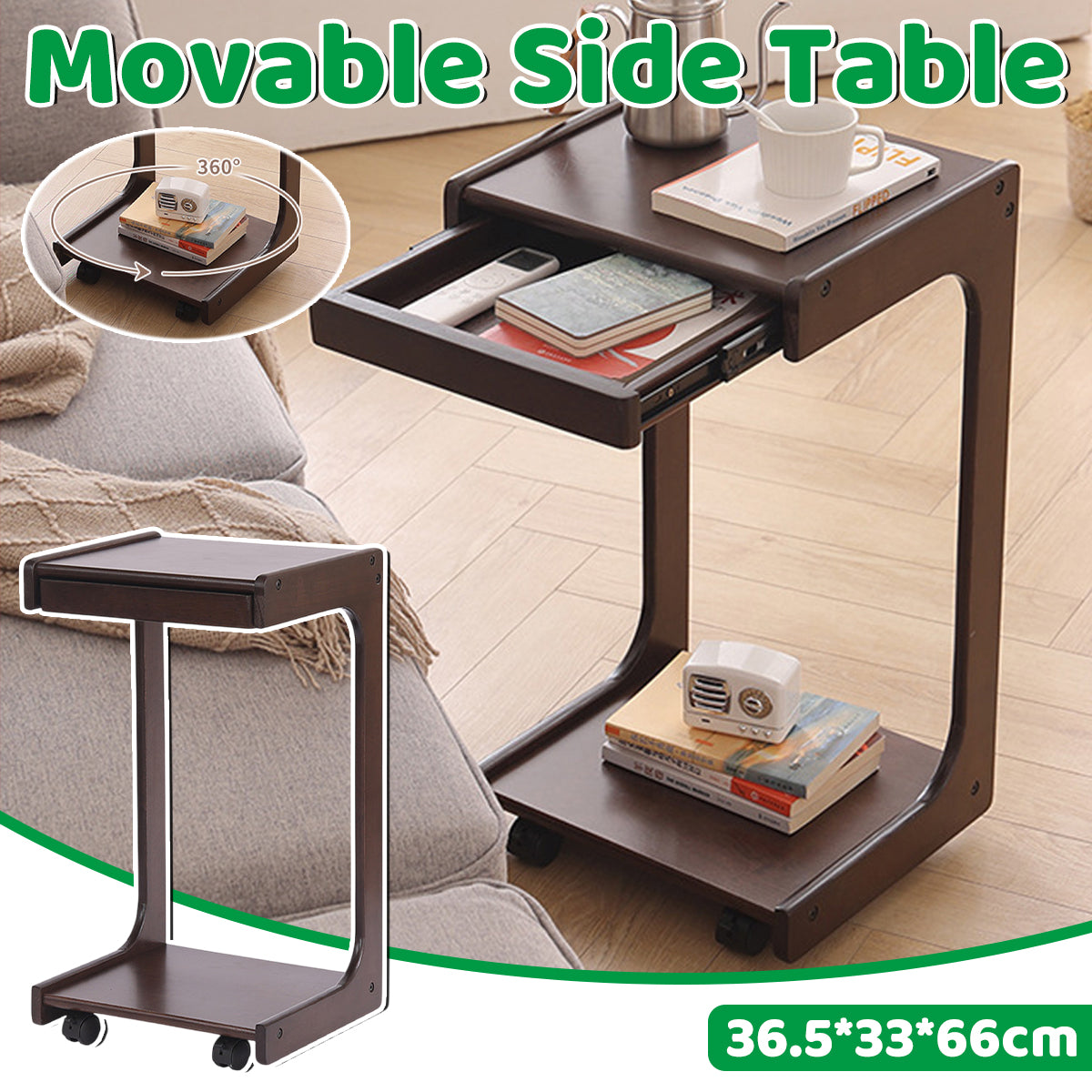 Upgrade your home with this solid wood rolling table. It features a unique C-shaped design with a spacious countertop and a hidden drawer for practical storage. Equipped with 360° universal wheels, the table moves smoothly between spaces, making it suitable for use in the living room, bedroom, office, or balcony.
