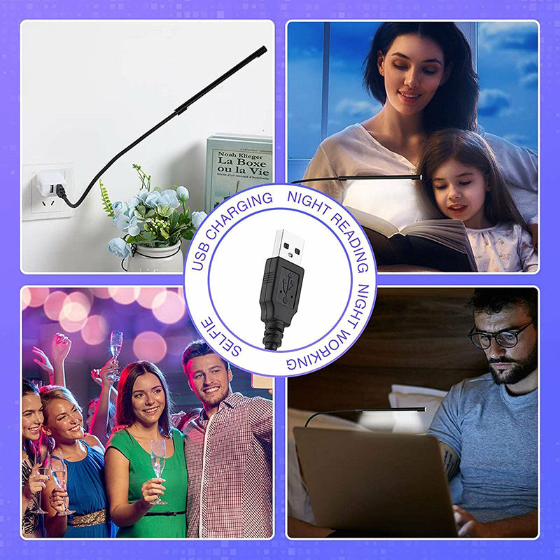 This flexible USB lamp features 10 LED lights and a bendable metal neck, allowing easy adjustment for illuminating keyboards, notebooks, or reading areas. It is powered directly through any USB port, offering convenient lighting for travel, office, or home use.